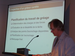 | Stéphane Mayrand, gréeur certifié ETCP - Aréna au Cirque du Soleil, explique la planification du travail de gréage. | Stéphane Mayrand explique la planification d'accrochage du pont téléphérique du spectacle Quidam dans le cadre de sa présentation. |